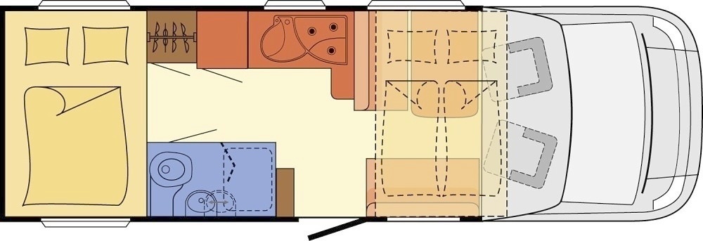 Befindet sich im hinteren Teil des Fahrzeugs über die gesamte Breite. Es ermöglicht Platz für den Wohnbereich und bietet gleichzeitig den Komfort eines Doppelbettes.