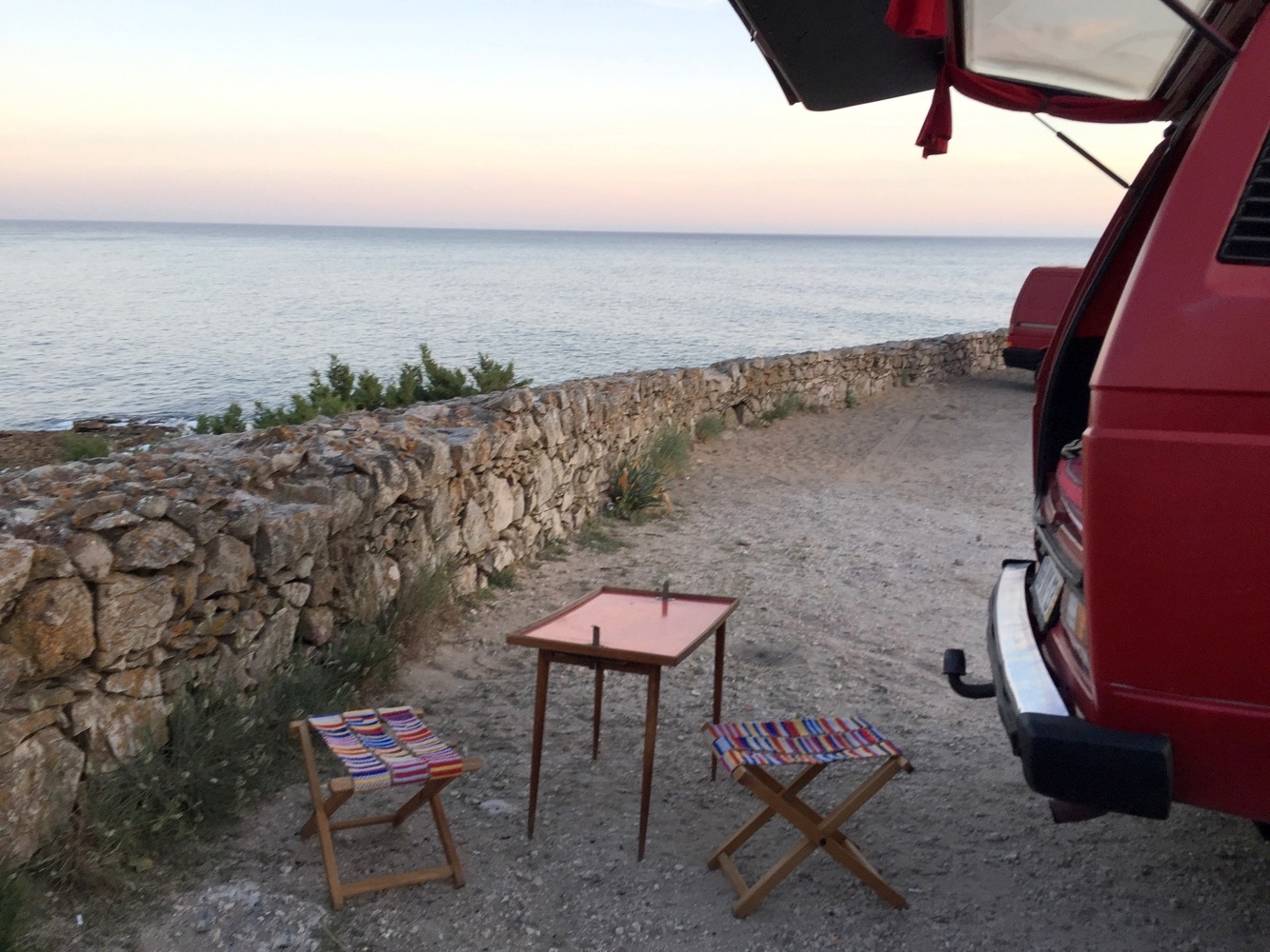 CHERRY can carry 5 persons, and has 2 double beds, one at the bottom and the other at the top (you can open it when you park and close it for driving). It has a small fridge to keep your food and drinks cool, a cooking stove to prepare your meals and a sink with 12 litres of water to wash dishes. A small table and 2 stools are provided to make it possible to enjoy your meals outside. If you need to charge your phones or computers you can do so with a socket that is connected to a second battery of the car. You can bring your music along with a USB cable device or personal CDs to enjoy the trip in your own mood.