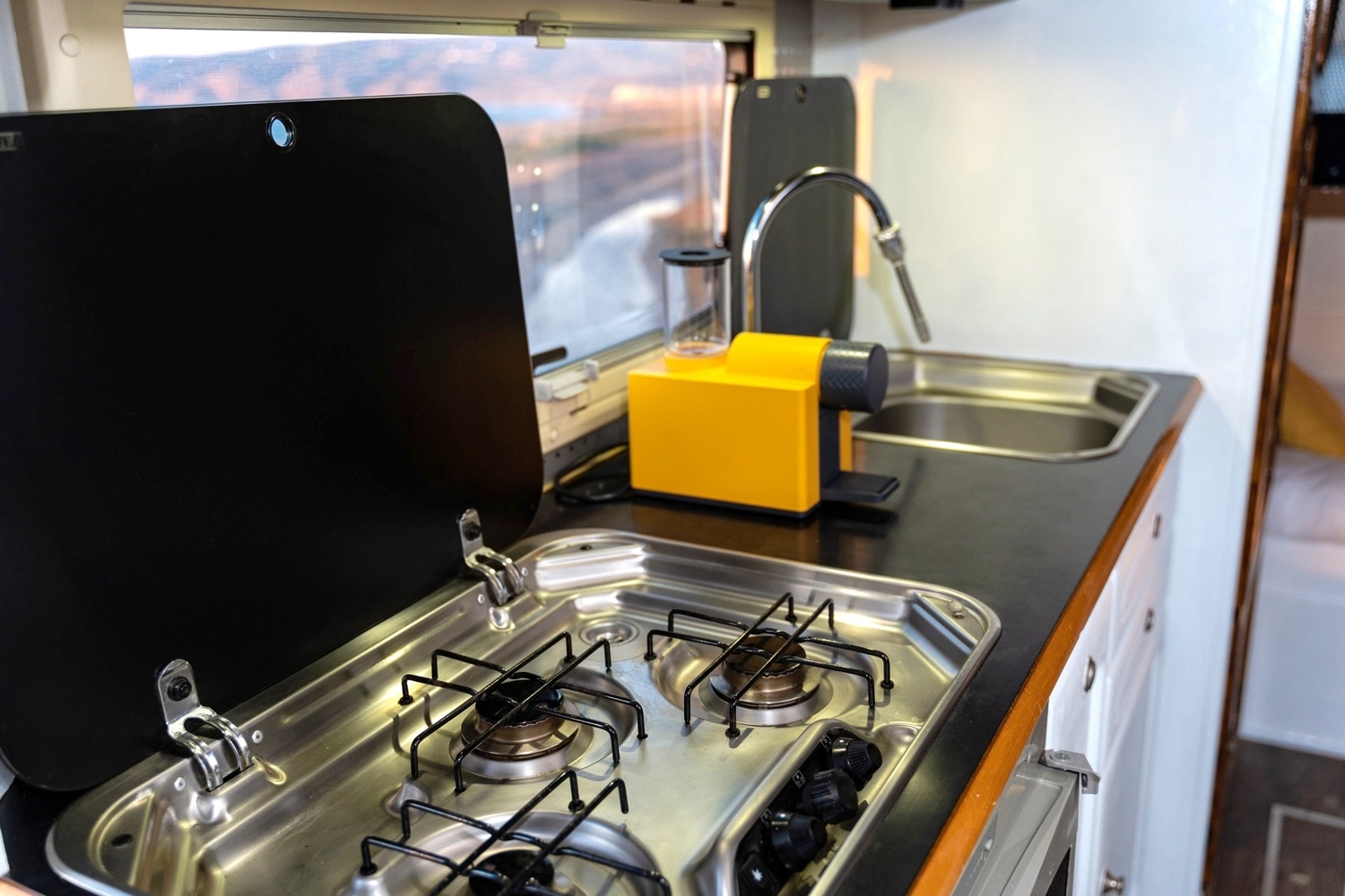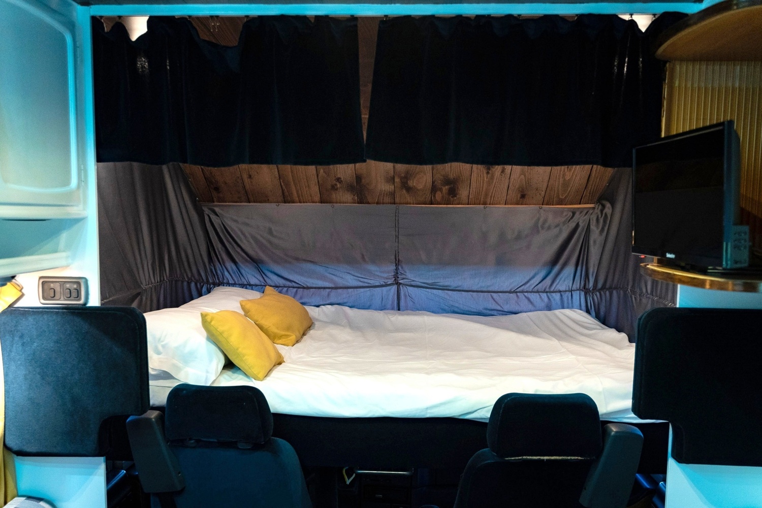Dies sind die Rücksitze, die sich in eine Schlaffläche umklappen lassen. So werden der Wohnraum erhalten und gleichzeitig zwei kompakte Schlafmöglichkeiten geschaffen.