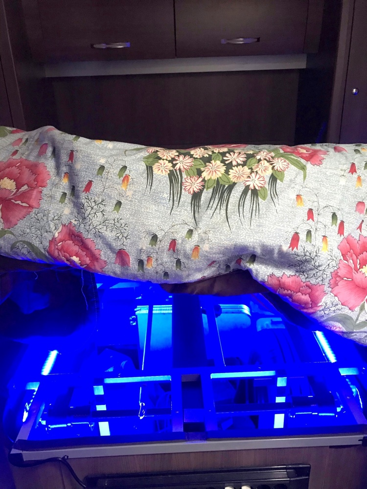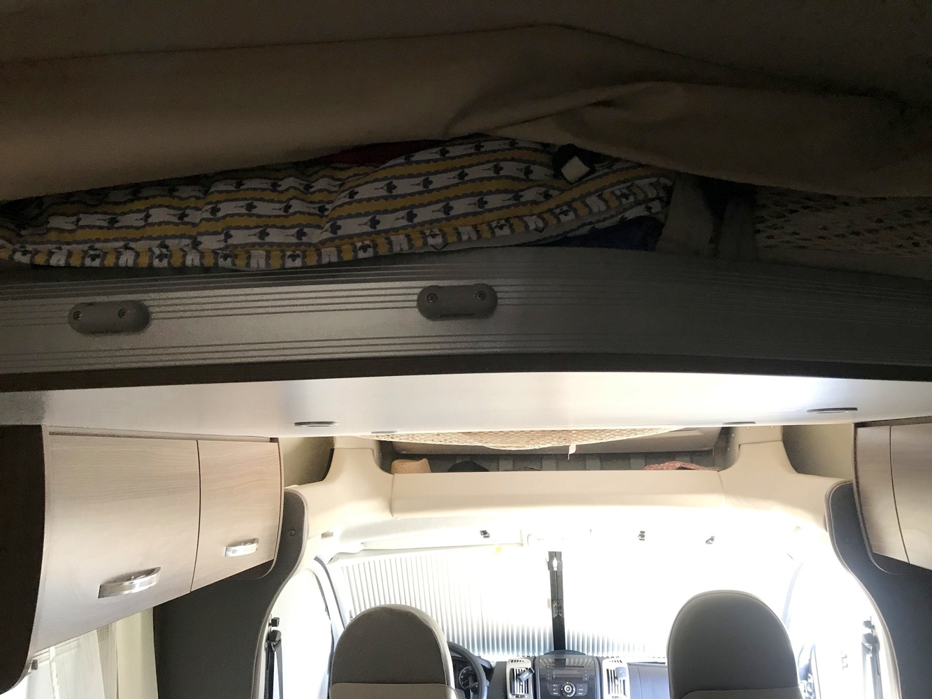 Dieses Bett wird vom Innenraum ausgefaltet und schafft so einen Schlafraum über dem Fahrzeug. So wird der Wohnraum im Fahrzeug nicht eingeschränkt.